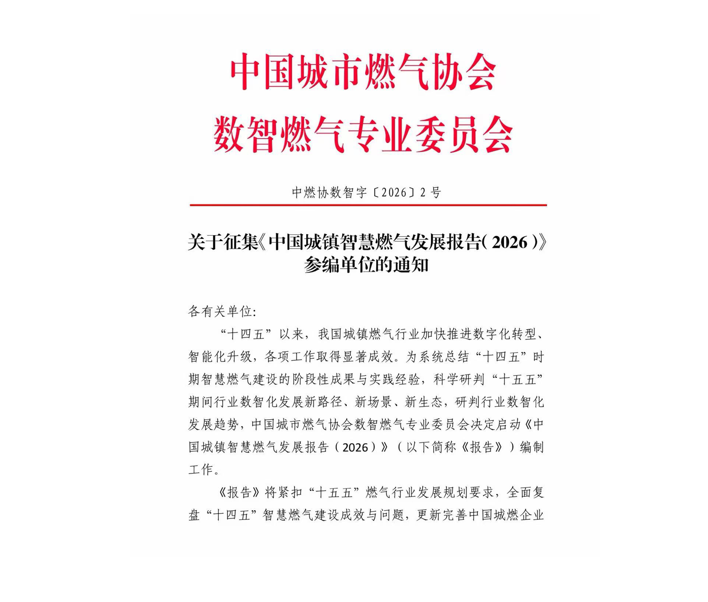 各有关单位:“十四五”以来,我国城镇燃气行业加快推进数字化转型、智能化升级,各项工作取得显著成效。为系统总结“十四五”时期智慧燃气建设的阶段性成果与实践经验,科学研判“十五五”期间行业数智化发展新路径、新场景、新生态,研判行业数智化发展趋势,中国城市燃气协会数智燃气专业委员会决定启动《中国城镇智慧燃气发展报告(2026)》(以下简称《报告》)编制工作。