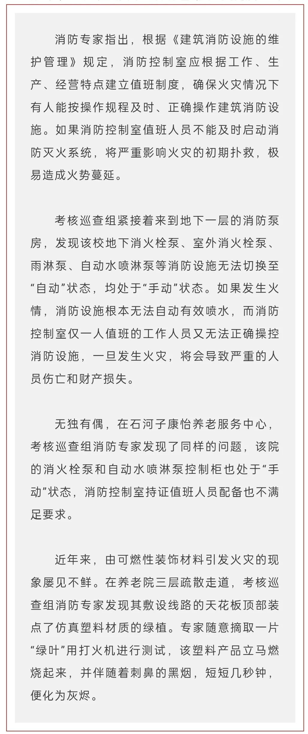 考核巡查组消防专家现场测试,该养老院三层疏散通道采用可燃物装饰材料。