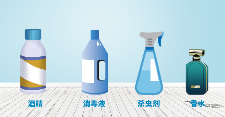 酒精、花露水、杀虫剂、香水等属于易燃物,遇到火星容易发生闪燃,使用时,切记远离灶台及其他可燃物。